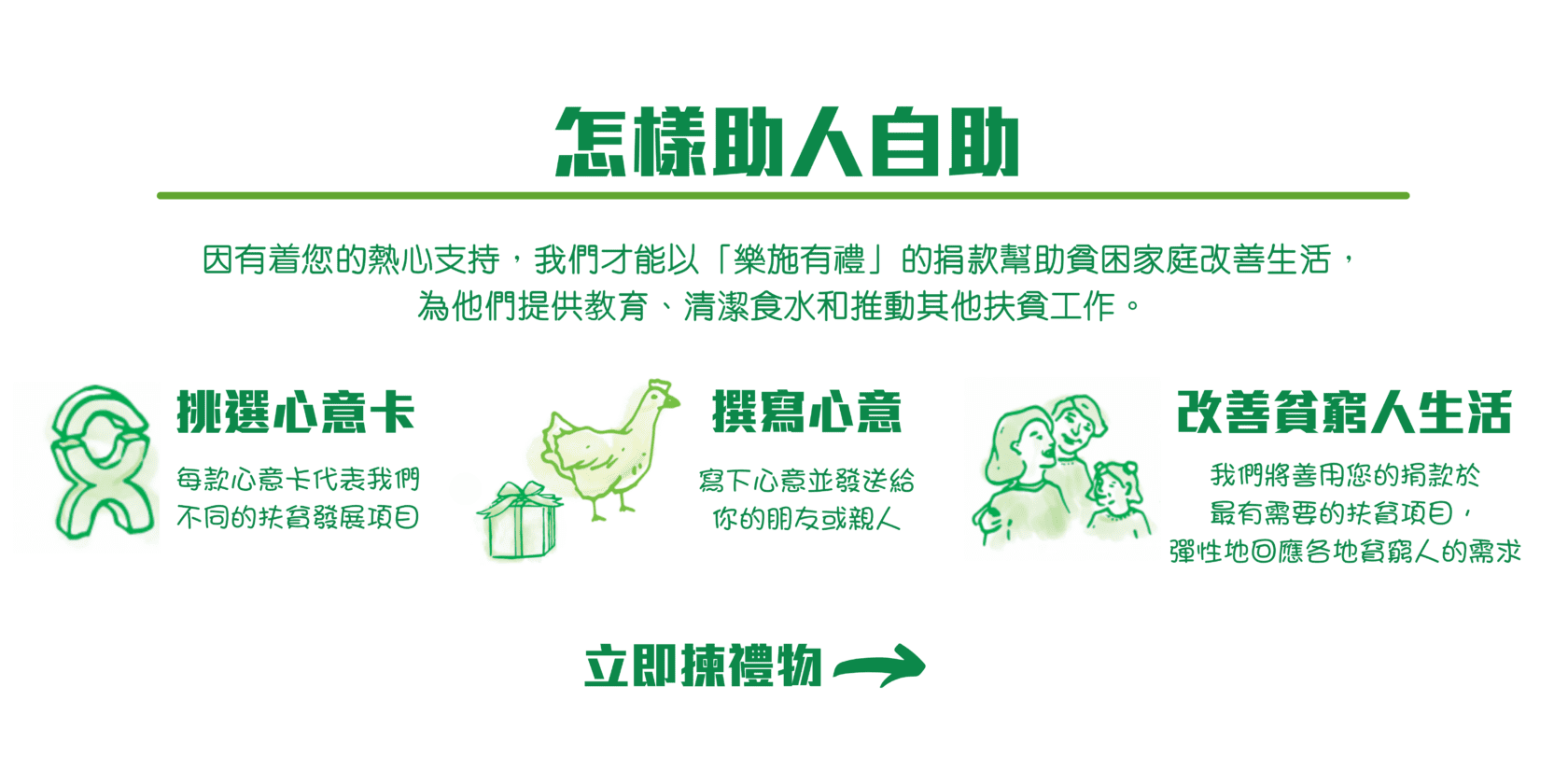 因有着您的熱心支持,我們才能以樂施有禮的捐款幫助貧困家庭改善生活,為他們提供教育、 清潔食水和推動其他扶貧工作 。
